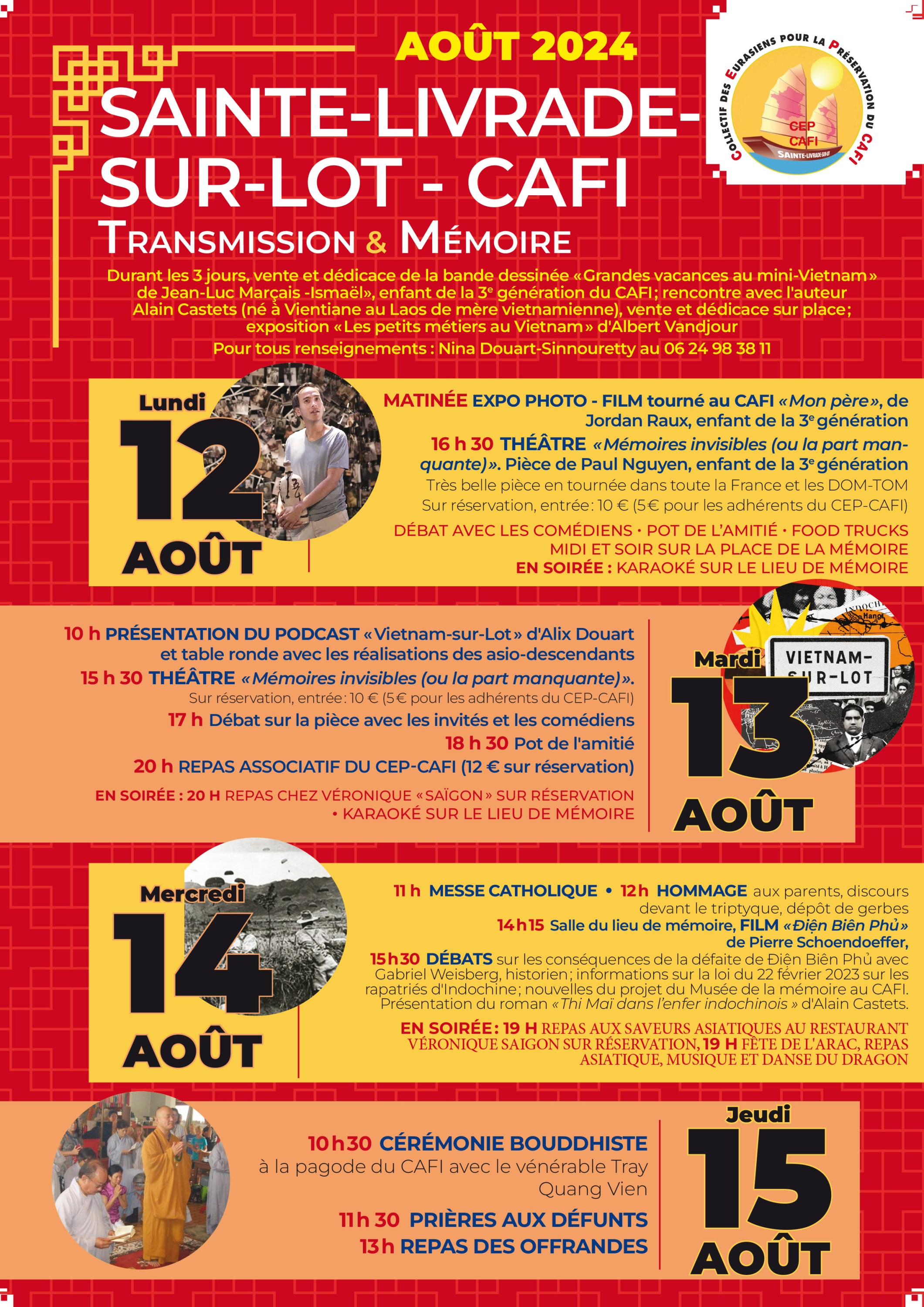 Programme des festivités organisées par le CEP-CAFI Chers amis, Cette année, nous sommes fiers de mettre en avant le travail de nos asio-descendants du CAFI pour la transmission et la mémoire de l’Indochine Française. Les tables rondes, les pièces de théâtre, le podcast, la bande dessinée, les livres, les thèses participent à la dynamique des jeunes de la 3e génération du CAFI qui s’emparent des questionnements mémoriels qui les traversent. Cette dynamique fait écho aux récentes pièces de théâtre : « Circulations capitales » de Marine Bachelot-Nguyen, « Mémoires invisibles ou la part manquante » de Paul Nguyen, « Saïgon » de Caroline Guiela Nguyen, au film « Mon père » de Jordan Raux, au podcast « Vietnam-sur-Lot » d’Alix Douart, aux thèses universitaires en psychiatrie de Paola Revue et à d’autres travaux de biens d’autres asio-descendants de la 3e génération du CAFI comme Nadège Lobateau … Ces projets ont dépassé les frontières du CAFI et ont suscité des entretiens pour la réalisation du projet « Entre deux rives » de Paul Nguyen, des articles de journaux de presse régionale et nationale, des émissions de radio et des tables rondes au siège du journal « le Nouvel Obs » et au festival ICI Vietnam le 15 juin 2024 à Paris, Ne manquez pas : . La table ronde du mardi 13 août 2024 à 10 h avec notre amie Lien Maffray-Lecrenn, modératrice, et la participation des derniers descendants du CAFI ayant réalisé un travail de mémoire . Le débat du mercredi 14 août (après le film), animé par Gabriel Weissberg, enfant de la 2e génération du CAFI de Bias, maître de conférences et professeur des universités à Toulouse. . Le CEP-CAFI et Pôleth Wadbled vous informeront des projets sur le Musée des mémoires du CAFI, de Noyant-d’Allier et du CAFI de Sainte-Livrade-sur-Lot. . Information en ce qui concerne l’extension de la loi du 23 février 2022 portant reconnaissance de la Nation envers les harkis, réparation en raison du traumatisme de l’exil et de la relégation, des mauvaises conditions de vie dans les camps, des conditions indignes, et la reconnaissance des Rapatriés d’Indochine, le projet doit être débattu à l’assemblée nationale prochainement. Au plaisir de vous voir et de vous revoir cet été pour de chaleureuses retrouvailles. Nina Sinnouretty