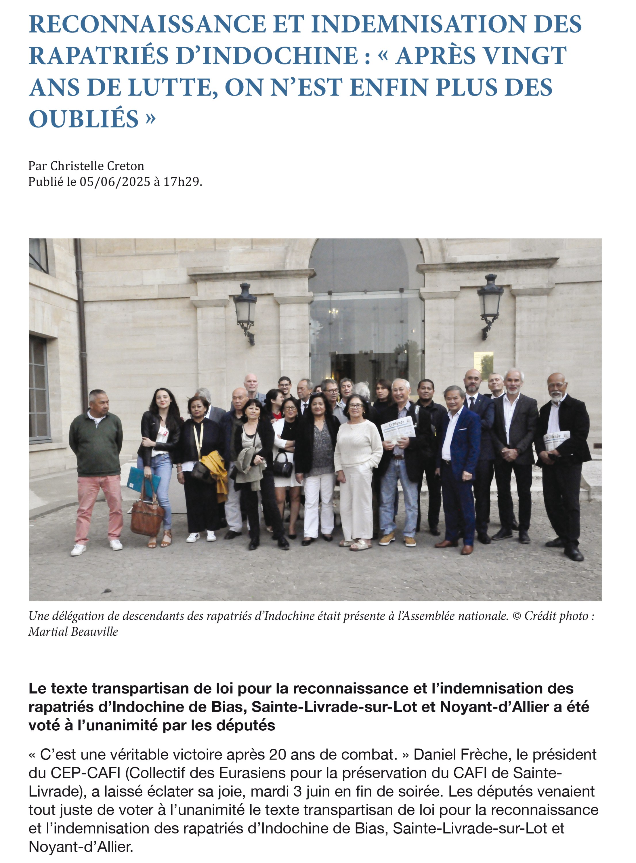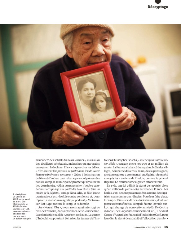 Julien Cao Van Tuat est arrivé en 1962 au camp de Noyans, un ancien village minier de l’Allier. Il a fermé administrativement en 1966 mais beaucoup de ces rapatriés sont restés sur place. Dès 2003, en écrivant au Premier ministre de l’époque, Jean-Pierre Raffarin, il a été l’un des premiers à se battre pour obtenir une reconnaissance officielle de France. Et tout ça intervient trop tard à ses yeux. «De cette génération-là et qui habite encore le village, il ne reste plus qu’une seule personne. Ce que je souhaite, c’est que cette tata-là puisse enfin avoir la reconnaissance de l’Etat sur son histoire à elle.»